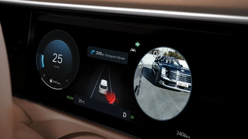 The all-new PALISADE Hybrid incluye Monitor de vista de punto ciego (BVM) en todas sus versiones. Este sistema muestra en el panel de instrumentos una imagen en tiempo real del lado correspondiente cuando se activa la luz direccional, ayudando a detectar vehículos en el ángulo muerto y a realizar cambios de carril con mayor confianza.