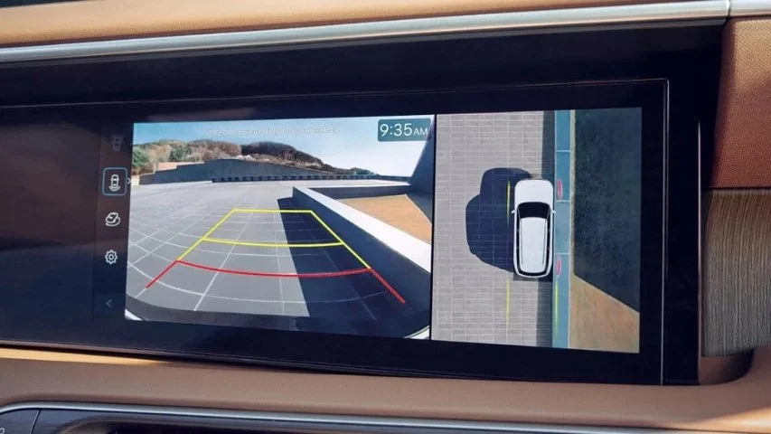 La cámara de visión 360° (SVM) del The all-new PALISADE Hybrid muestra una vista periférica del entorno del vehículo con marcadores de distancia en pantalla, ayudando a calcular con mayor precisión el espacio disponible frente a obstáculos al maniobrar o estacionar.
