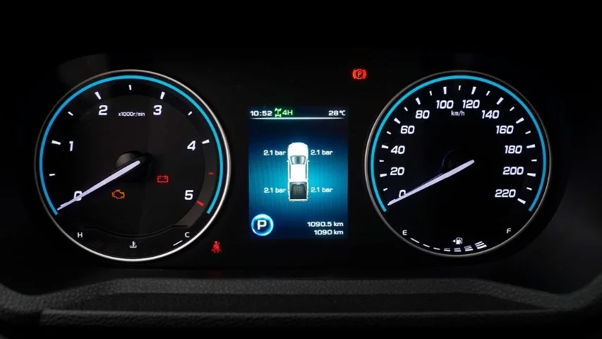La Grand Avenue 4x4 presenta un panel de instrumentos con dos relojes analógicos principales para velocímetro y tacómetro, acompañados por una pantalla central digital que muestra datos clave de conducción como recorrido, consumo y estado del vehículo.